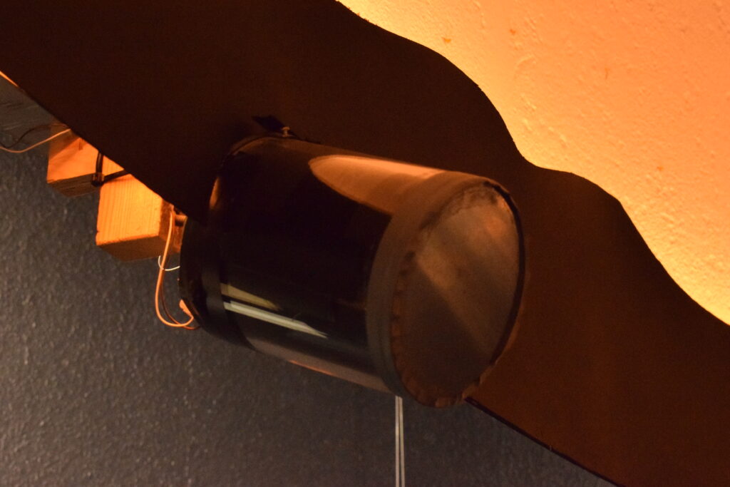 Der Milchstraßenprojektor ist bei uns ähnlich realisiert, wie bei den großen Planetariumsprojektoren: In der Mitte eines transparenten Zylinders, auf den die Form der Milchstraße aufgemalt ist, befindet sich eine Lampe. Dadurch erreicht man an der Kuppel einen diffusen Schattenwurf in der Form der Milchstraße. Da sowohl Lage als auch Form der Milchstraße an Sommer- und Winterhimmel unterschiedlich sind, haben wir zwei dieser Projektoren am Kuppelrand montiert, die mit dem Sternhimmel umschaltbar sind. Zusätzlich sind sie in der Helligkeit noch dimmbar.