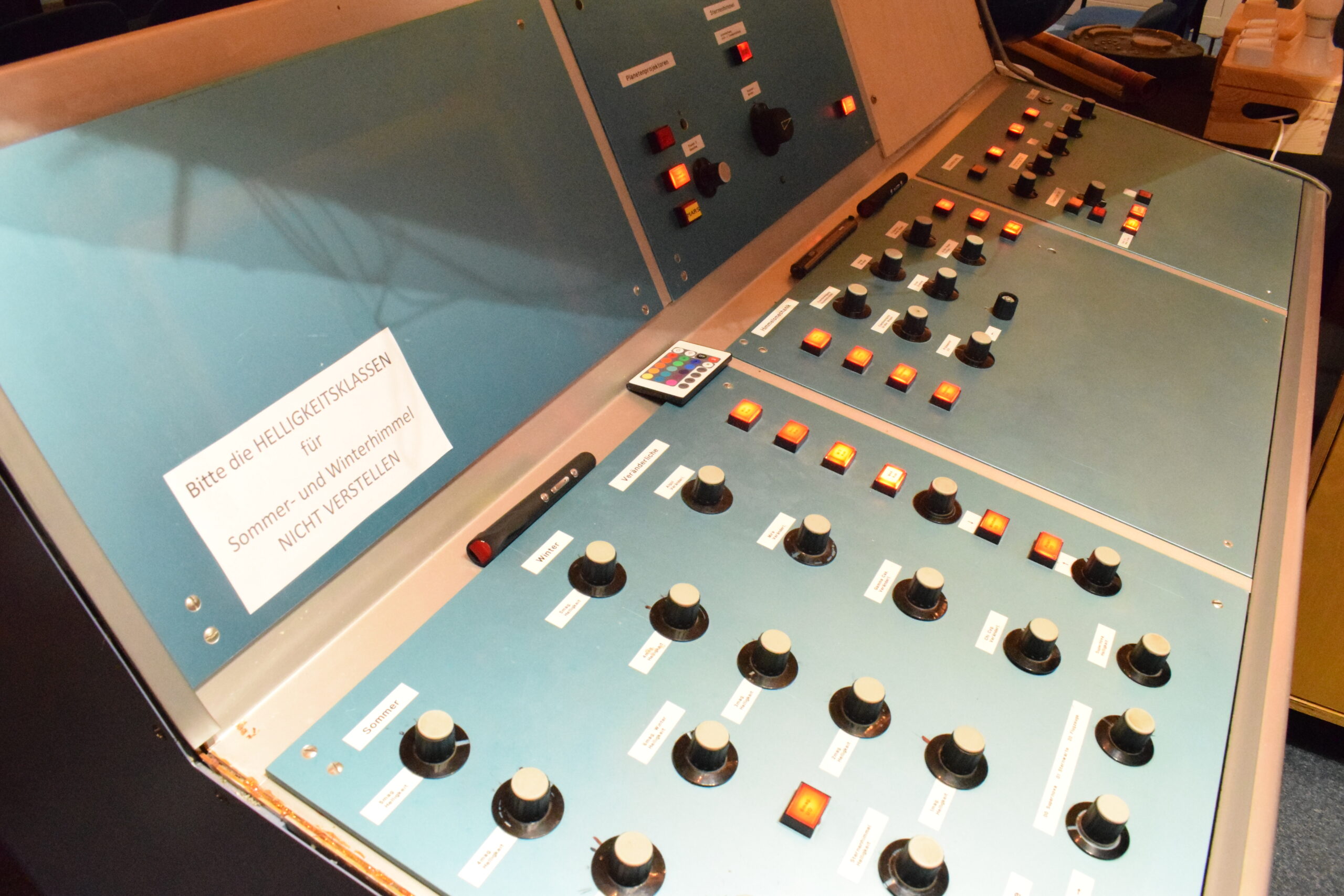 Aufgrund der einfachen Technik ist auch die Ansteuerung und Bedienung des Planetariums sehr leicht (auch wenn das Bild unseres Schaltpults anderes vermuten läßt). Die Vorführungen werden komplett manuell und ohne Automatik gefahren, was in der heutigen Zeit der Vollautomatiken eher archaisch anmutet; wer sich aber schon mal über abgestürzte Rechner oder ähnliches geärgert hat, kann nachvollziehen, warum wir bewußt auf eine Computersteuerung verzichten. Außerdem haben wir so jederzeit während einer Vorführung die Möglichkeit, auf Besucherfragen einzugehen und auch mal schnell ungeplant auf einen anderen Sternhimmel umzuschalten, wodurch wir einfach wesentlich flexibler bleiben, als mit jeder Automatik.