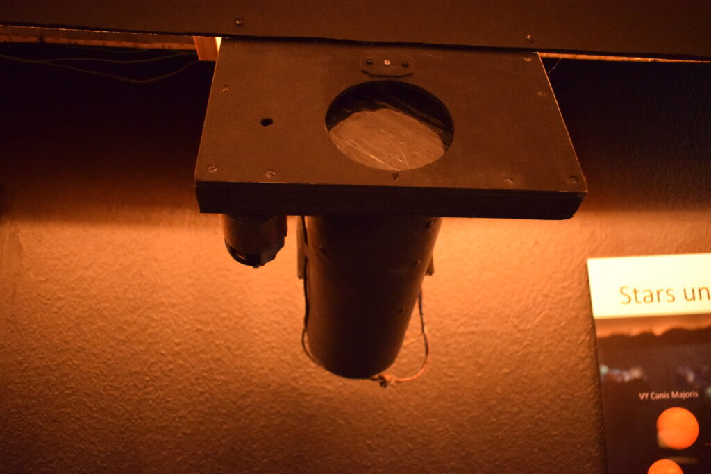 Die technische Realisierung unseres Planetariums ist denkbar einfach: An jeder Stelle, an der am Himmel ein Stern sein muß, befindet sich eine Leuchtdiode (insgesamt ca. 2000). Die Leuchtdioden werden entsprechend der realen Sternhelligkeiten in fünf verschiedene Helligkeitsstufen unterteilt (was für einen natürlichen Eindruck ausreichend ist), was dazu führt, daß bei uns alle Sterne (auch die hellsten) wie in der Natur immer punktförmig sind. Bei der Technik der herkömmlichen Planetariumsprojektoren werden die helleren Sterne immer durch größere Scheibchen dargestellt, was unnatürlich wirkt. Hier hat unsere einfache Technik sogar deutliche Vorteile, die uns auch von Experten bestätigt wurden.