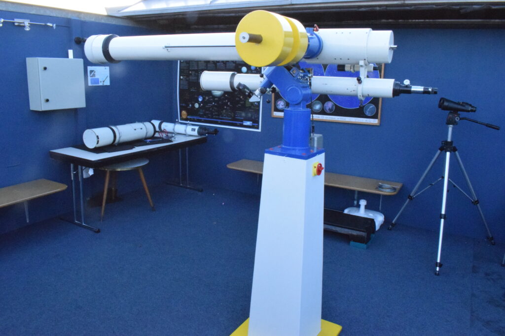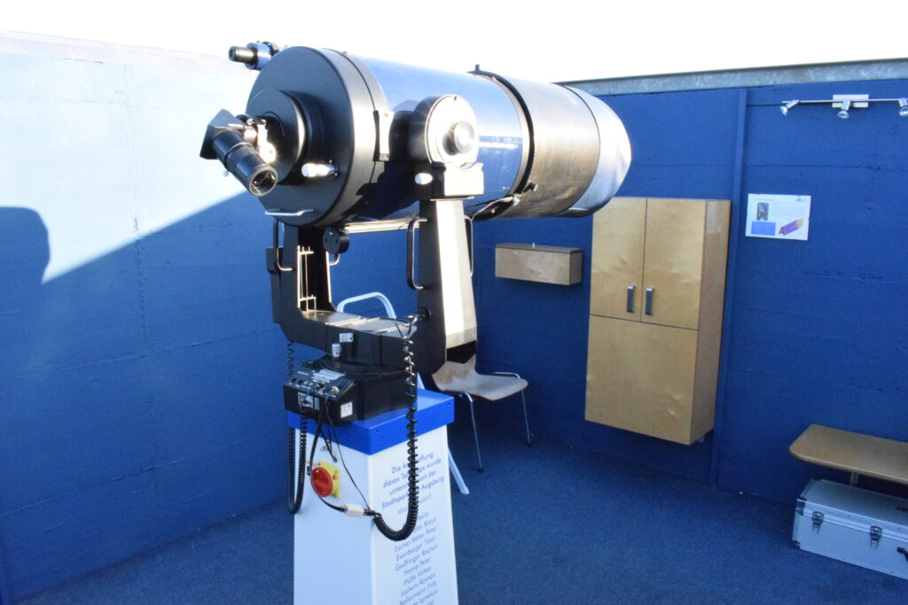 Unser 15cm Coudé-Refraktor mit 2,7m Brennweite auf einer deutschen Montierung ist durch seinen (egal wo das Fernrohr hinzeigt) ortsfesten Einblick sehr angenehm für unsere Besucher. Das von der Fa. Wachter gebaute Gerät gehörte ursprünglich unserem Gründungsmitglied Dr. Zumach und wurde dann von uns (nachdem er es lange Zeit dankenswerterweise als Leihgabe zur Verfügung stellte) übernommen. Sehr gut geeignet ist es für Mond- und Planetenbeobachtung; aufgrund der Bildfelddrehung ist es allerdings für Fotografie nicht einsetzbar. Parallel zum Refraktor ist aber noch eine 20cm Flatfield-Kamera montiert, an die mit T2-Adaptern normale Spiegelreflexkameras angeschlossen werden können.