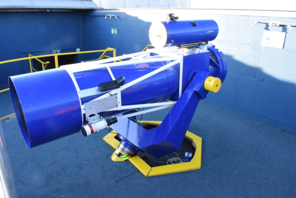 Unser größtes Gerät ist der (bis auf den Spiegel) komplett selbstgebaute Newton auf einer großen Gabelmontierung. Nach einigen Umbauten und Ergänzungen hat er inzwischen einen Stand erreicht, der ihn auch für unseren Fotografen geeignet macht. Hier ist vor allem auch die Lüftung des Hauptspiegels zu nennen, die eine deutlich schnellere Anpassung der Spiegeltemperatur an die Umgebung ermöglicht. Ganz neu ist auch der Einbau einer FS2-Steuerung, der die Nachführung und Feinsteuerung zu deren Korrektur bei fotografischem Einsatz sowie die Anzeige der Koordinaten ermöglicht; die Einstellung auf ein Objekt erfolgt aber noch manuell und nicht motorisch.